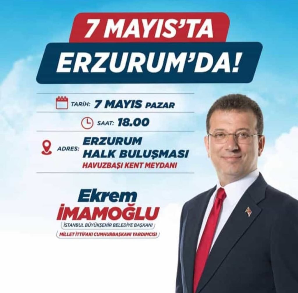 Millet İttifakı Cumhurbaşkanı Yardımcısı Adayı ve İBB Başkanı Ekrem İmamoğlu, seçim çalışmaları kapsamında 7 Mayıs Pazar günü Erzurum’da çeşitli temaslarda bulunacak. Esnafları ziyaret edecek olan İmamoğlu, ardından saat 18:00’de Havuzbaşı Kent Meydanında “Erzurum Halk Buluşması” programında halkla buluşacak.