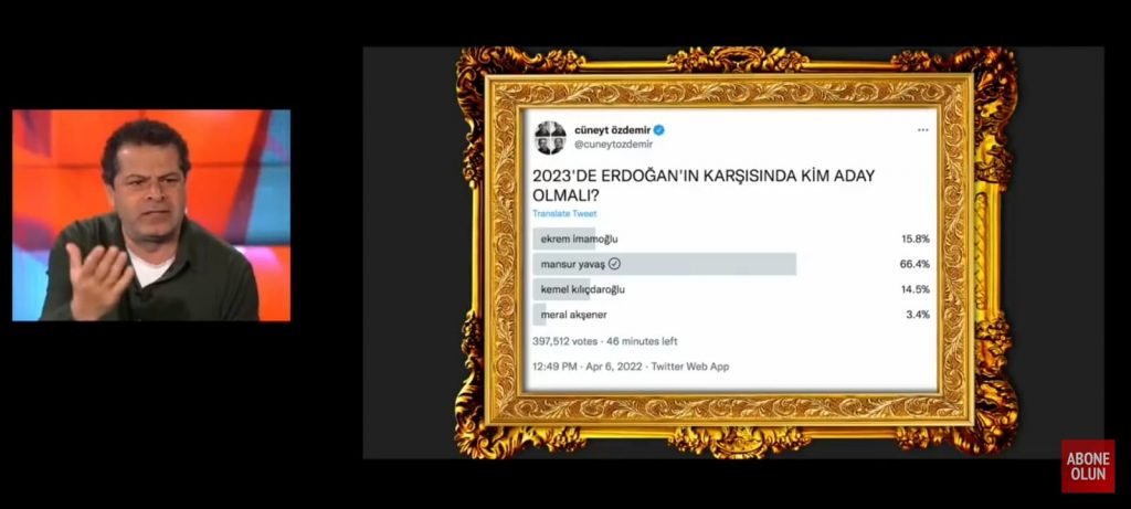 Gazeteci Cüneyt Özdemir takipçilerine “Millet İttifakı’nın Cumhurbaşkanı adayı kim olmalı?” sorusunu yöneltti. 400 binden fazla kişinin katıldığı anketten yüzde 66,4 ile Mansur Yavaş birinci çıkarken, onu yüzde 15,7 ile İBB Başkanı Ekrem İmamoğlu takip etti.